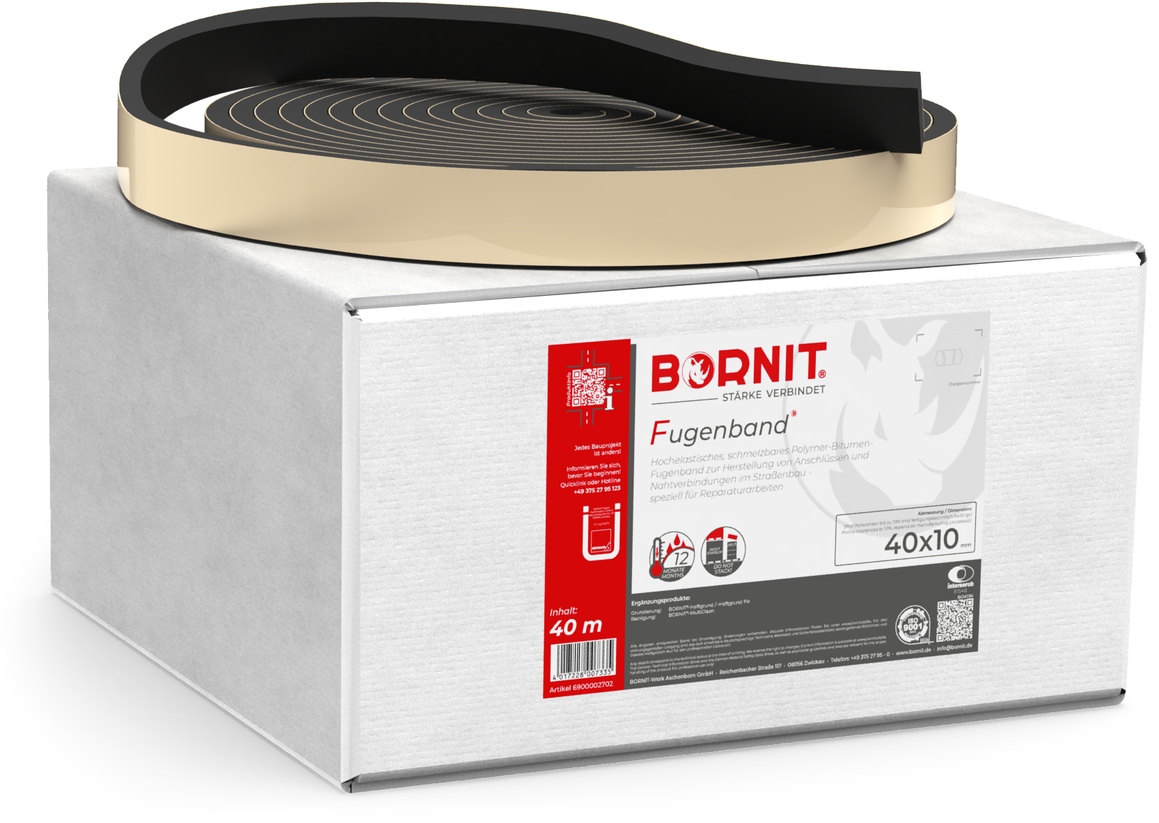 Elastisches, schmelzbares Bitumen-Fugenband mit hoher Eigenklebrigkeit und guten Haftungseigenschaften; flexiblen Fugen- und Nahtverbindung im Straßenbau bei Rand- und Arbeitsfugen zwischen Asphalt und Asphalt, zur Nahtverbindung bei Reparaturarbeiten mit Heißasphalt, alterungsbeständig, widerstandsfähig gegen starke Verkehrs- und Witterungseinflüsse. Geprüft nach ZTV Fug-StB 15. Grundierung mit BORNIT®-Haftgrund-Fix oder BORNIT®-Haftgrund.