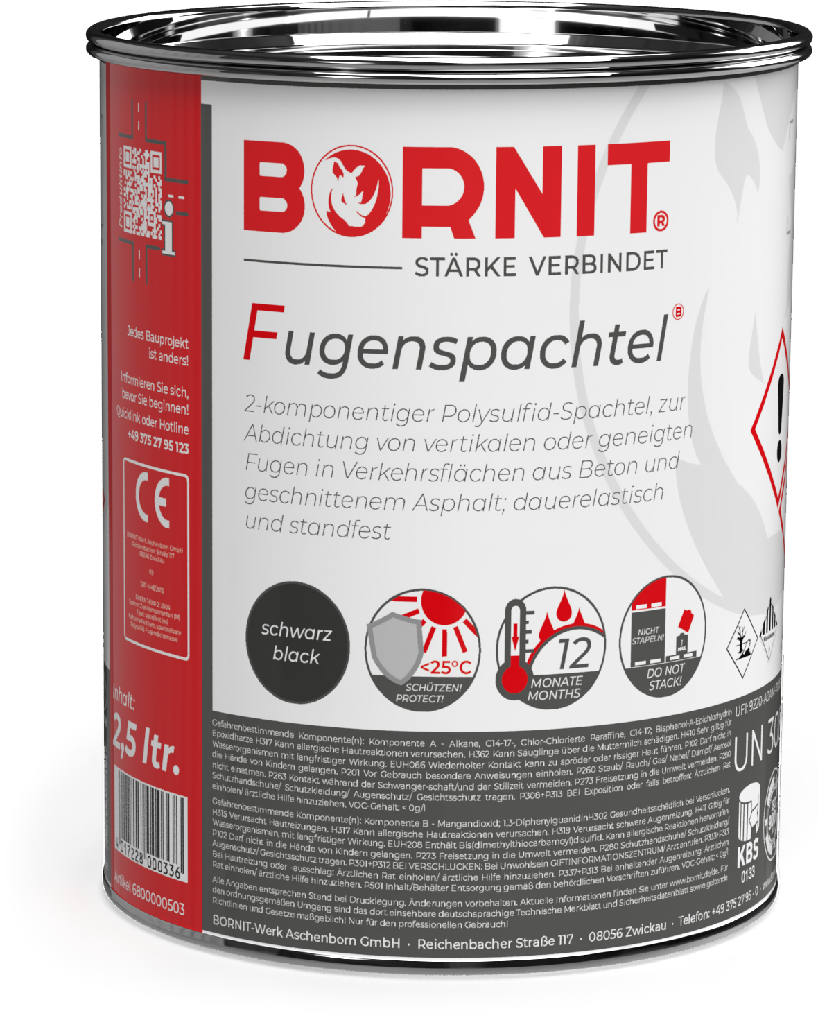 Standfester Fugenspachtel auf Polysulfid-Basis, 2-komponentig, zur Abdichtung von vertikalen oder geneigten Fugen in Verkehrsflächen aus Beton und geschnittenen Asphaltflächen, dauerelastischer Fugendichtstoff mit hoher mechanischer Belastbarkeit. Grundierung je nach Anwendungsfall mit BORNIT®-Betonprimer oder BORNIT®-Asphaltprimer. BORNIT®-Fugenspachtel entspricht der DIN EN 14 188-2.