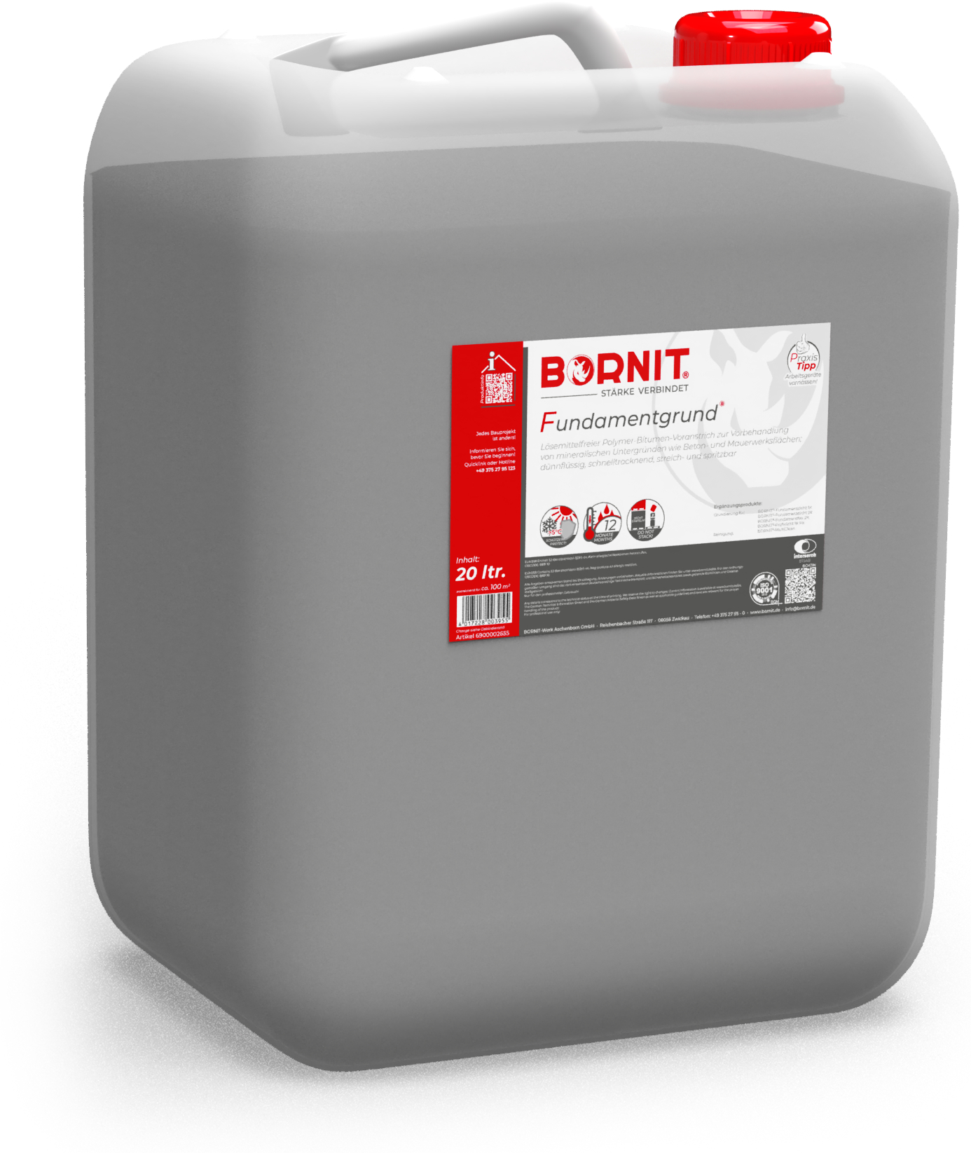 Lösemittelfreier Polymer-Bitumenvoranstrich zur Grundierung von Beton-, Putz- und Mauerwerksflächen, dünnflüssig, streich- und spritzfähig, schnelltrocknend, als Voranstrich für BORNIT®-Fundamentdicht 1K, BORNIT®-Fundamentdicht 2K, BORNIT®-Fundamentflex 2K und BORNIT®-Profidicht 1K Fix zu verwenden.