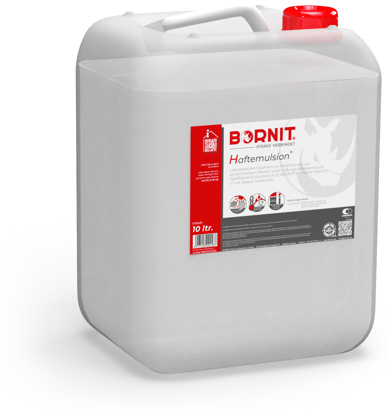 Wässrige, weichmacherfreie Dispersion zur Modifizierung von Mörtelmassen, zur Herstellung von Haftbrücken, Haft- und Flickmörtel, Sperrputzen, Sperrestrichen, haftungsverbessernder Zusatz für BORNIT®-Dichtungsschlämme Grundierung für Abdichtungen mit BORNIT®-Profidicht Hybrid 2K.