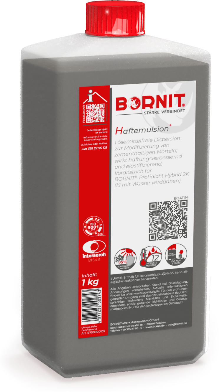 Wässrige, weichmacherfreie Dispersion zur Modifizierung von Mörtelmassen, zur Herstellung von Haftbrücken, Haft- und Flickmörtel, Sperrputzen, Sperrestrichen, haftungsverbessernder Zusatz für BORNIT®-Dichtungsschlämme Grundierung für Abdichtungen mit BORNIT®-Profidicht Hybrid 2K.