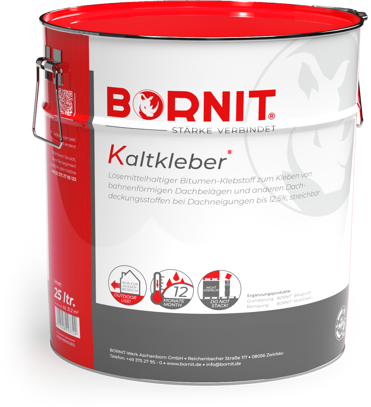 bituminöser Dachkleber, kalt streichbar, ohne Füllstoffe, lösemittelhaltig, für die Verklebung von Dachbahnen, Pappen, Schindeln u.a. bei Dachneigung bis 12,5°. Haftet auf Beton, Mauerwerk und Putz. Grundierung mit BORNIT®-Bitugrund.