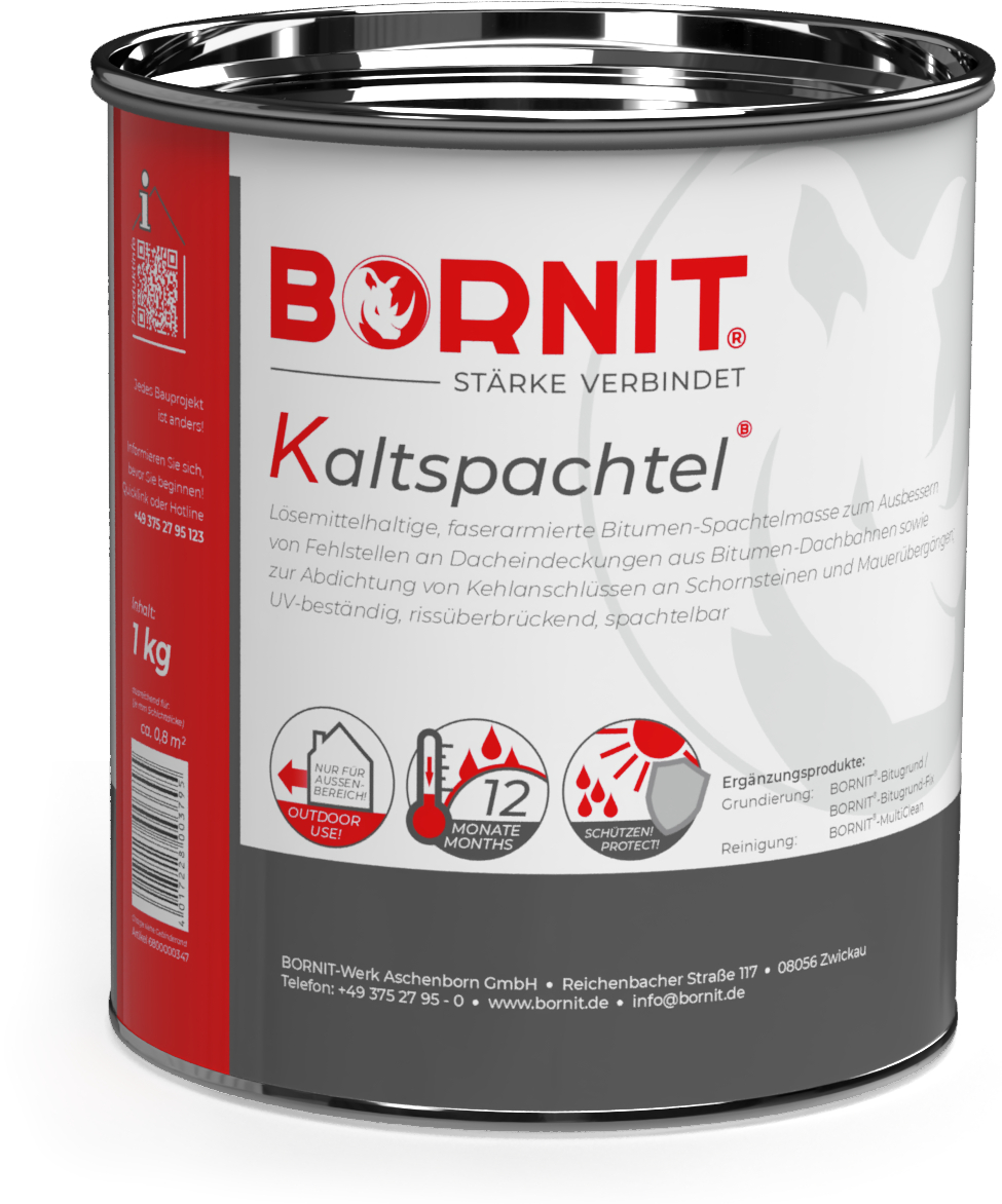 Bitumenspachtel für Flächen- und Abschlussabdichtungen, UV-beständig, gute Haftung auf Beton, Mauerwerk, Putz, bituminösen Belägen und metallischen Untergründen. Zur Abdichtung von Kehlanschlüssen an Schornsteinen und Mauerübergängen, rissüberbrückend, wasserdicht, lösemittelhaltig, bis -5°C verarbeitbar. Geprüft nach AIB. Grundierung mit BORNIT®-Bitugrund.