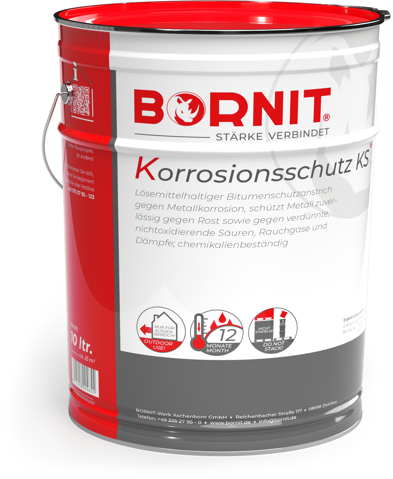 Bitumenschutzanstrich gegen Metallkorrosion, schützt Metall zuverlässig gegen Rost sowie gegen verdünnte, nichtoxidierende Säuren, Rauchgase und Dämpfe, lösemittelhaltig; geprüft nach AIB, chemikalienbeständig nach DIN 53 168.