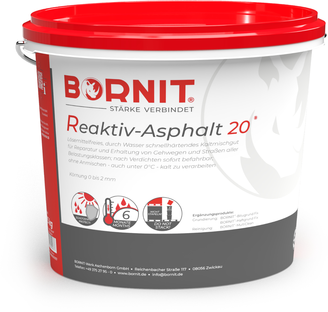 Reaktiv, durch Wasser schnell aushärtendes Kaltmischgut für Reparatur und Erhaltung von Straßen, Gehwegen, Bahnsteigen, Einfahrten und Höfen, leicht und ohne Anmischen kalt verarbeitbar, nach Verdichten sofort befahrbar, für Asphalt- und Betonstraßen aller Belastungsklassen, ausgezeichnete Standfestigkeit und Haltbarkeit, unter 0°C einbaubar, überbaubar, recyclingfähig, lösemittelfrei und umweltschonend, Körnung 0 bis 2 mm.