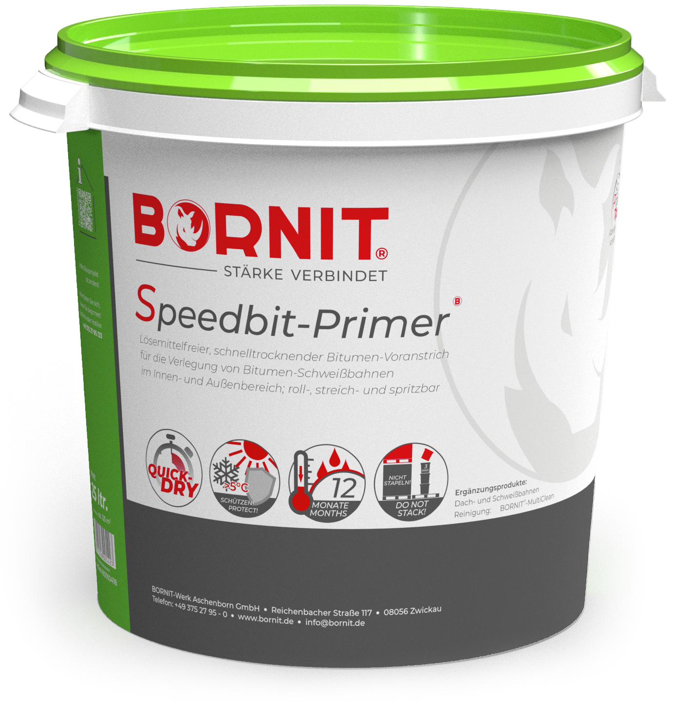 schnelltrocknender, roll-, streich- und spritzfähiger Elastomer-Bitumen-Voranstrich; lösemittelfrei, auf matt feuchten Untergründen einsetzbar - dringt tief in den Untergrund ein, speziell für Arbeiten in Innenräumen empfohlen. Grundierung für Bitumenemulsionsanstriche und Schweißbahnen. Optimaler Voranstrich für die Greenline-Produkte BORNIT®-Flexbit, BORNIT®-Dachbit und BORNIT®-Unibit.