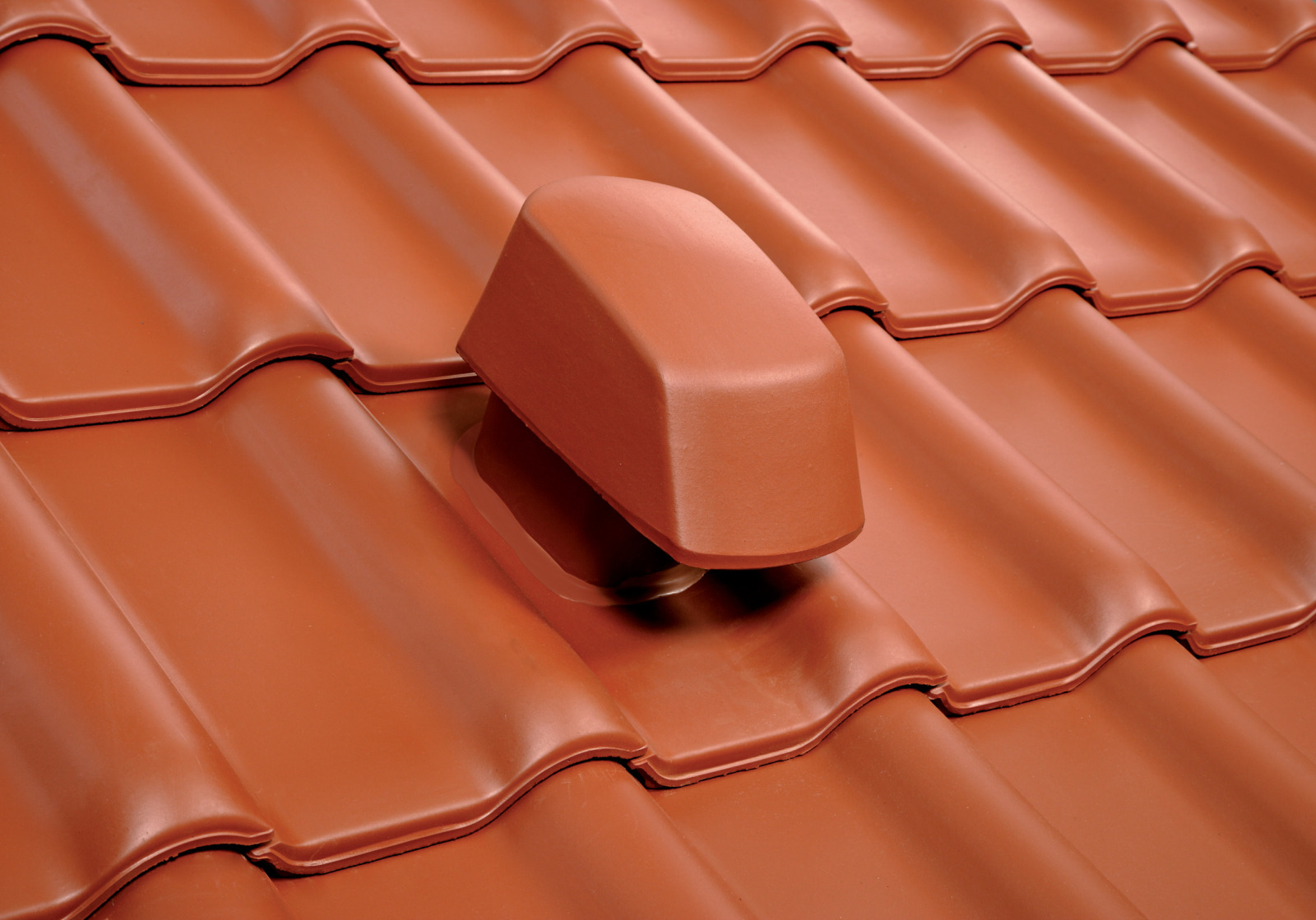 Für eine materialgleiche und formschöne Entlüftung aufsteigender Lüftungsleitungen bietet Braas Ton Sanilüfter passend zur Dachdeckung an.