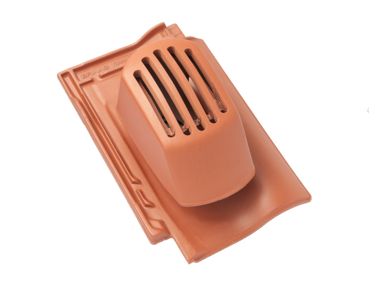 Für eine materialgleiche und formschöne Entlüftung aufsteigender Lüftungsleitungen bietet Braas Ton Sanilüfter passend zur Dachdeckung an.