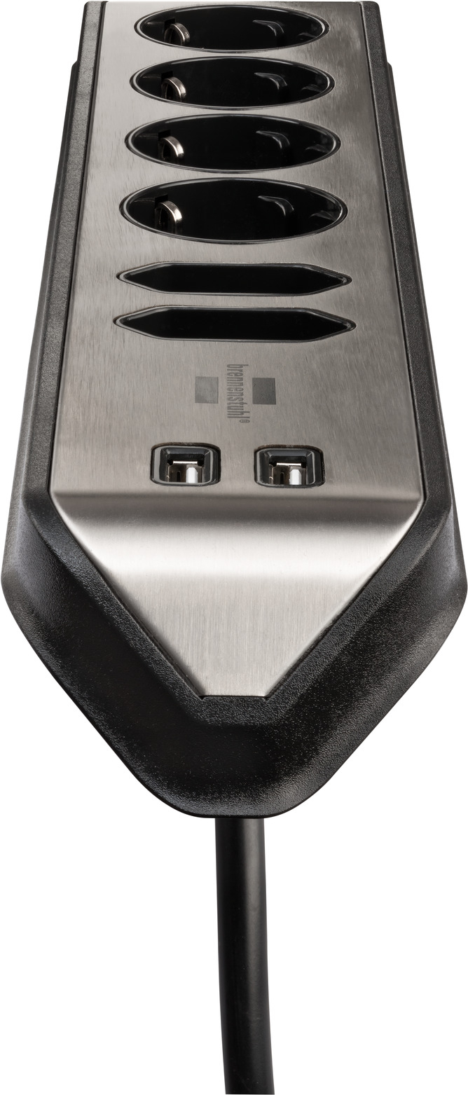 - Tischsteckdose 6-fach mit 2-USB Ladebuchsen (max. 3.1 A), 4 Schutzkontakt-Steckdosen in 45°-Anordnung und 2 Euro-Steckdosen in 90°-Anordnung