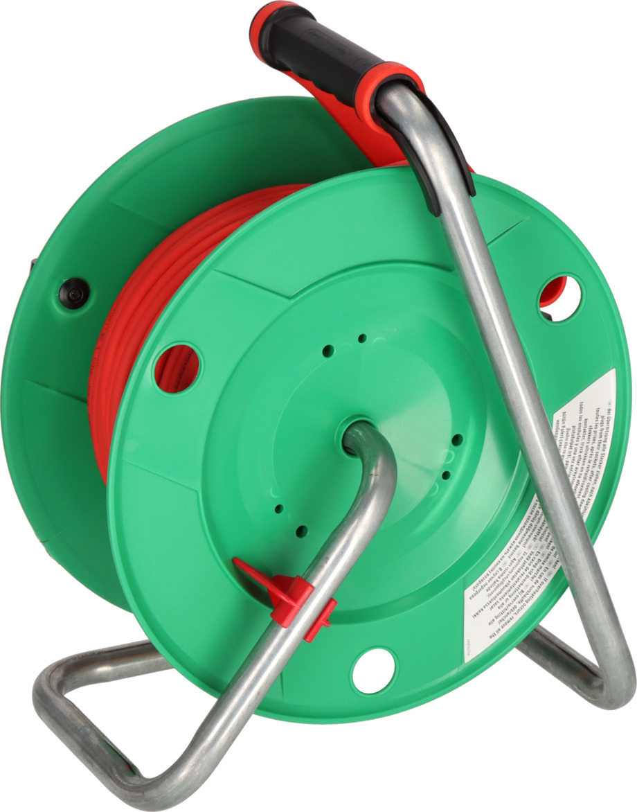 - Garten-Kabeltrommel mit Trommelkörper aus Spezialkunststoff auf verzinktem Tragegestell mit zusätzlichem Überhitzungsschutz und Kontroll-Leuchte bei Überhitzung und Überlastung