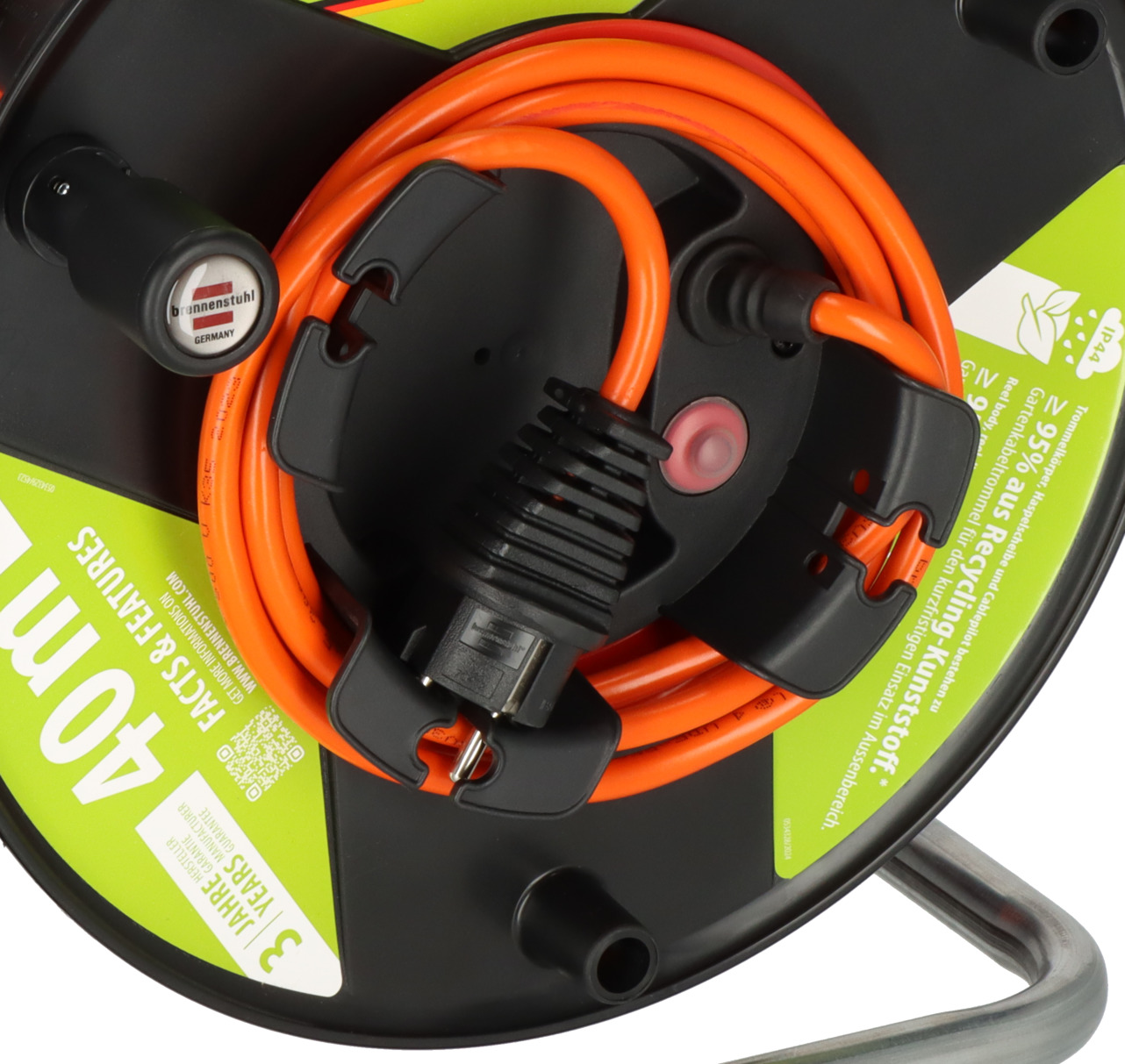 • Der Trommelkörper, cablepilot und die Haspelscheibe der Garten-Kabeltrommel bestehen zu ≥ 95% aus Recycling-Kunststoff (PCR/PIR)