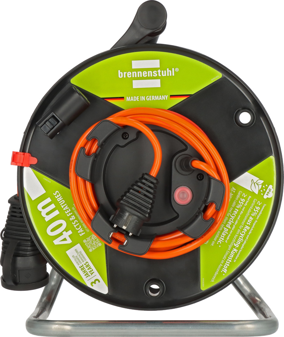 • Kabelrolle mit verzinktem Tragegestell, Überhitzungsschutz und Kontroll-Leuchte bei Überhitzung und Überlastung - mit praktischer Kabelhalterung und Steckergarage zum schnellen Verstauen des Kabels