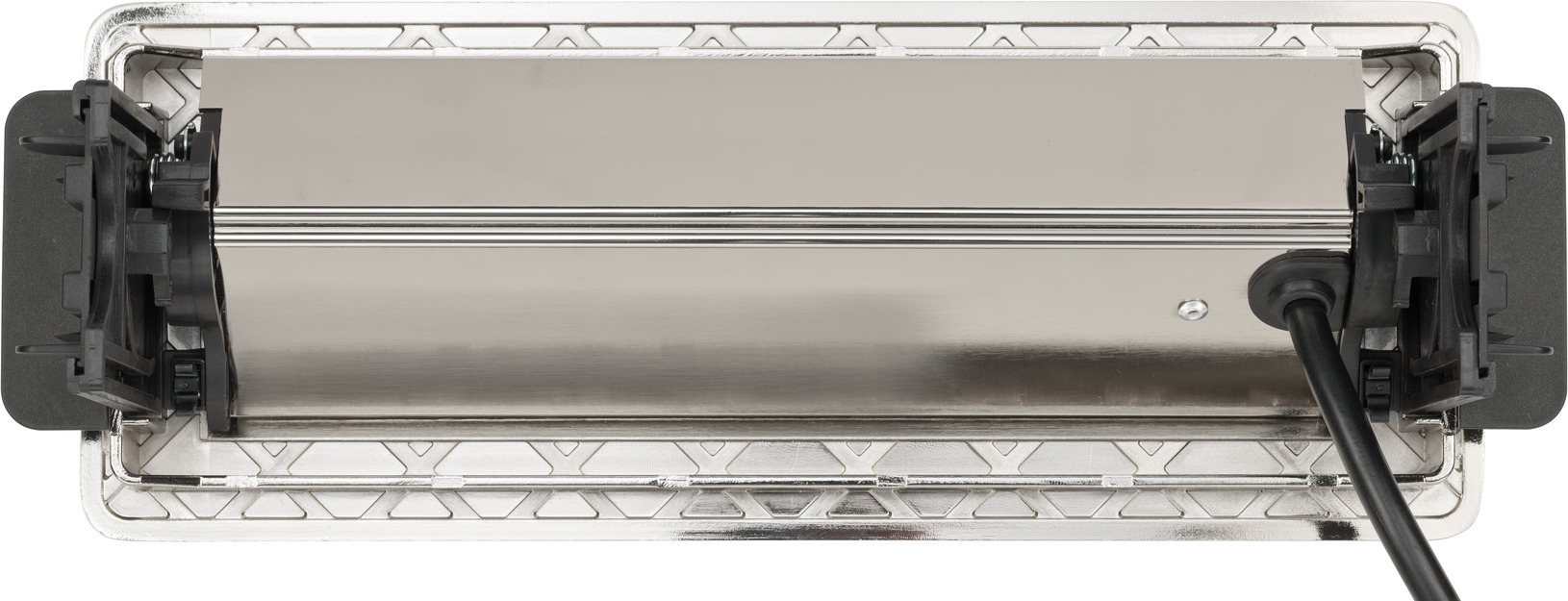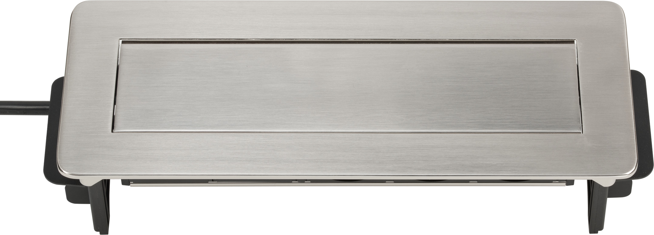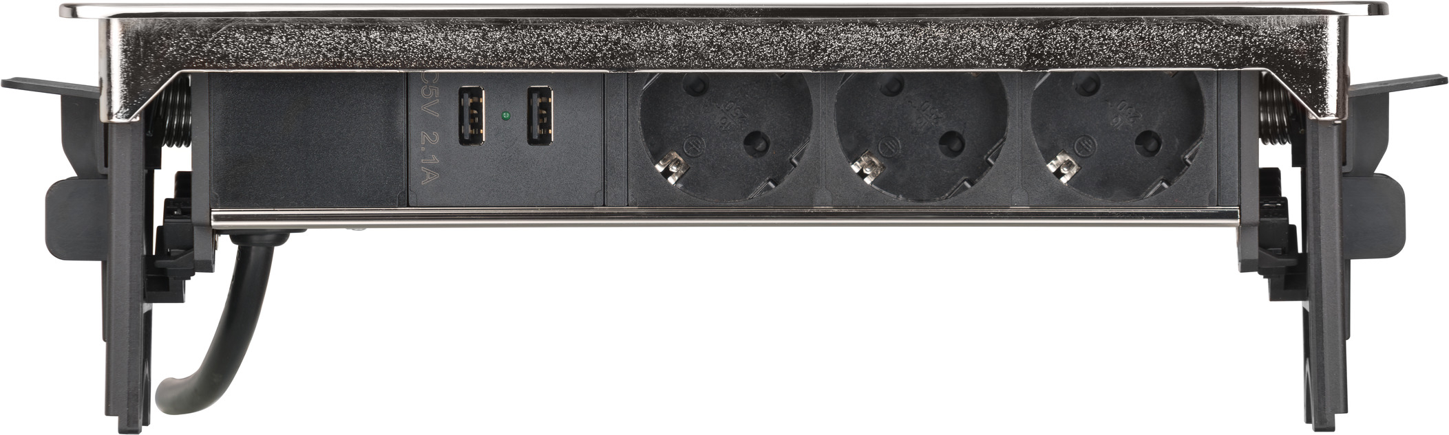- Versenkbare Steckdosenleiste mit erhöhtem Berührungsschutz: Kunststoffplättchen verschließen die Kontakte der Steckdose