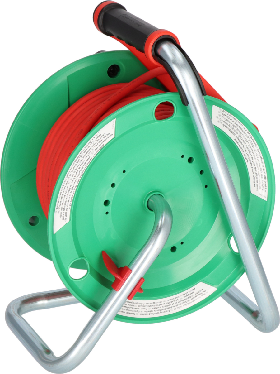 • Garten-Kabeltrommel mit Trommelkörper aus Spezialkunststoff auf verzinktem Tragegestell mit zusätzlichem Überhitzungsschutz und Kontroll-Leuchte bei Überhitzung und Überlastung