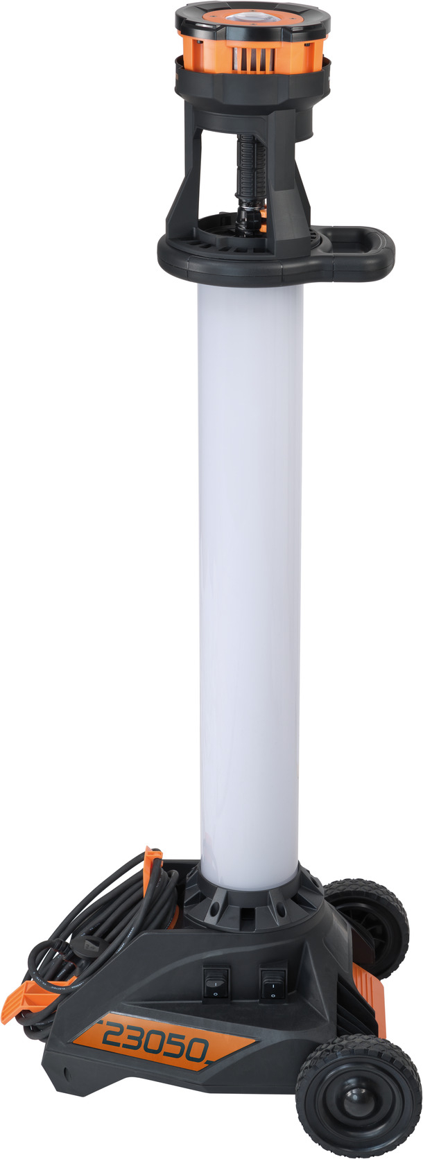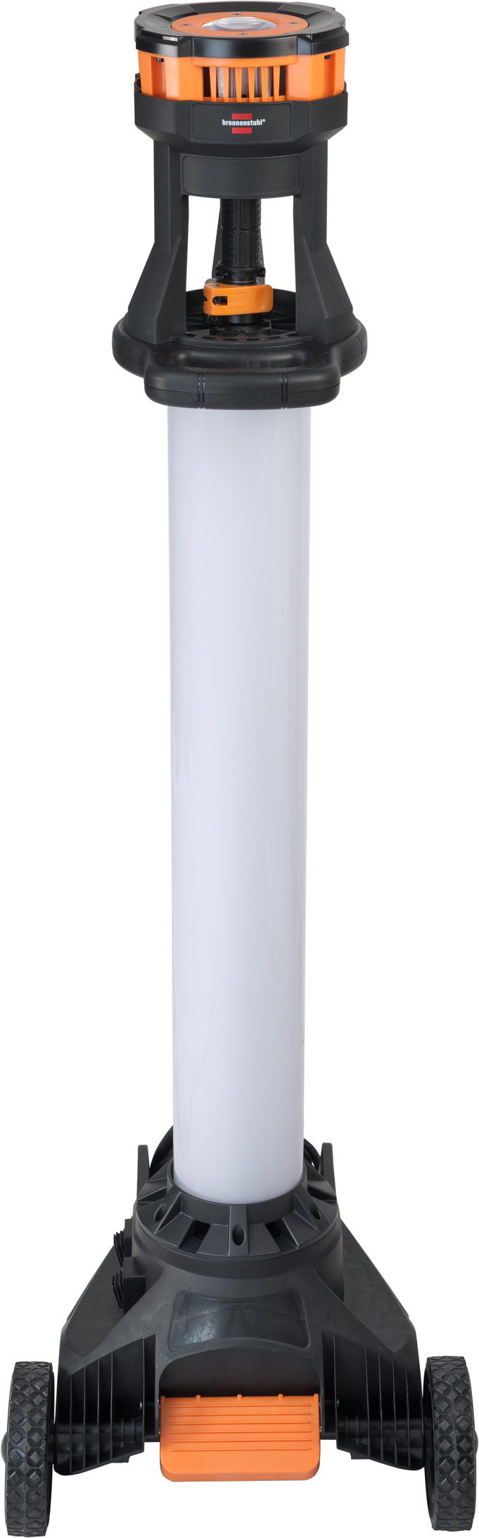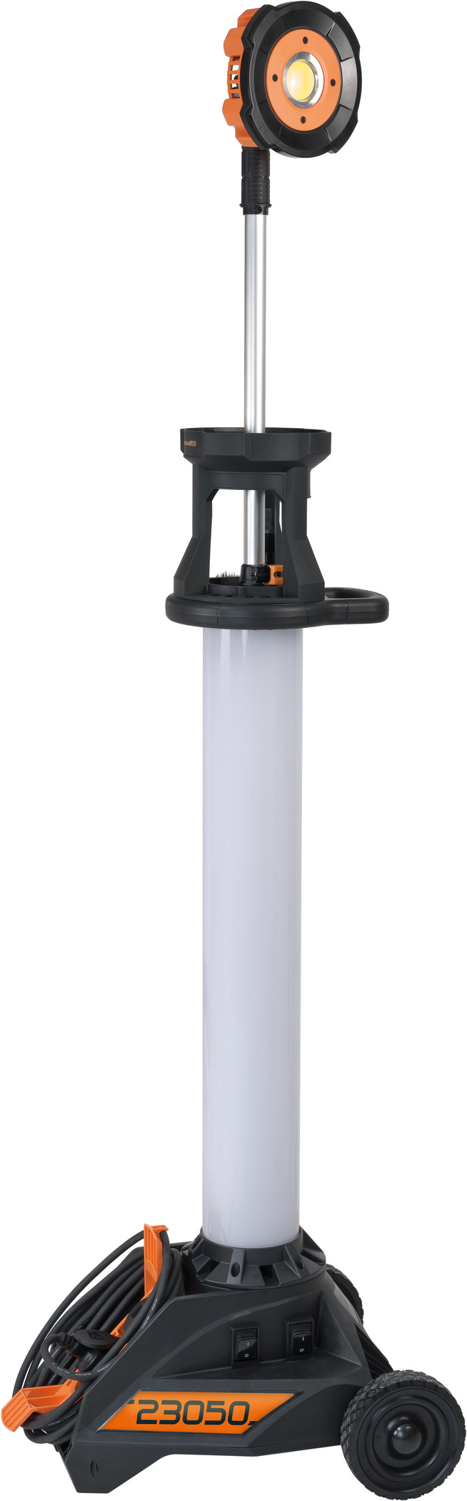 • 360° Standleuchte (100% / 50% / 25%) mit leuchtstarken 23700 lm verfügt zusätzlich über ein ausziehbares Teleskop (max. 1,73 m Höhe) mit einem weiterem Strahler mit 3200 lm, welcher flexibel neig- und schwenkbar ist