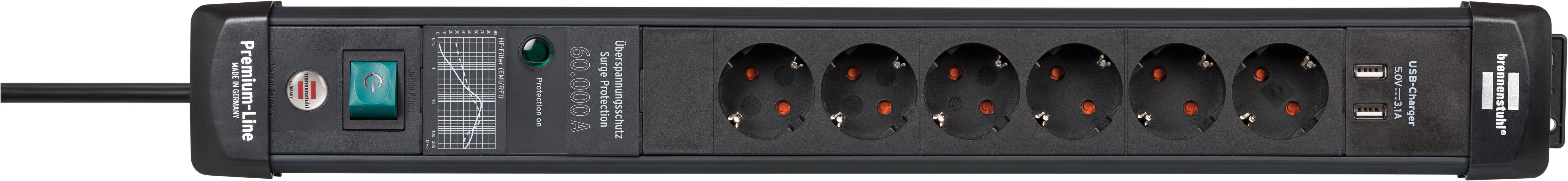 Premium-Line Steckdosenleiste 6-fach mit Überspannungsschutz bis zu 60.000 A (Mehrfachsteckdose mit 3m Kabel, Schalter und 2x USB max. 3100 mA, Steckdosenleiste Wandmontage, Made in Germany)
