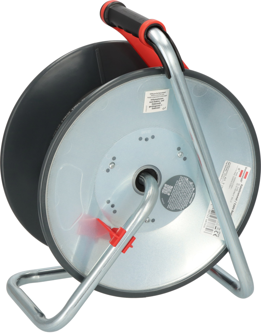 - Kabeltrommel 25m (H07RN-F 3G1,5) mit einem Trommelkörper aus Stahlblech, der auf der Vorder- und Rückseite schutzisoliert ist - für den Baustelleneinsatz nach DGUV 203-006 (ehem. BGI 608) und den ständigen Einsatz im Freien