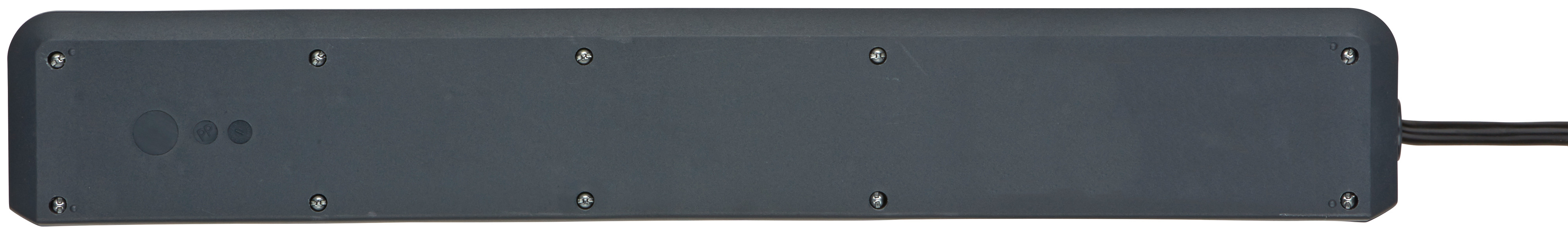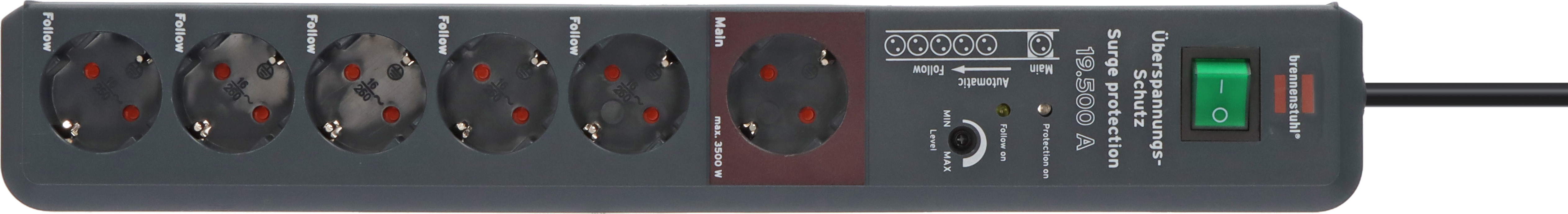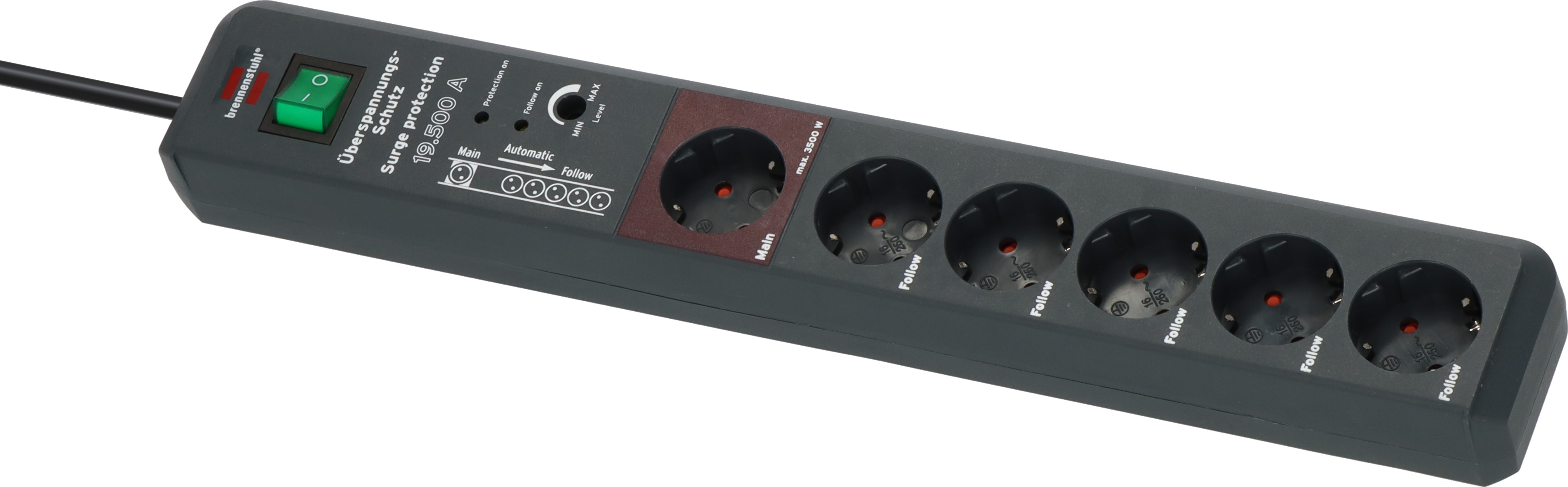 - Steckerleiste mit beleuchtetem Sicherheitsschalter zum Ein- und Ausschalten (zweipolig) und je einer Funktionskontroll-Leuchte für Überspannungsschutz und Follow-Steckdosen