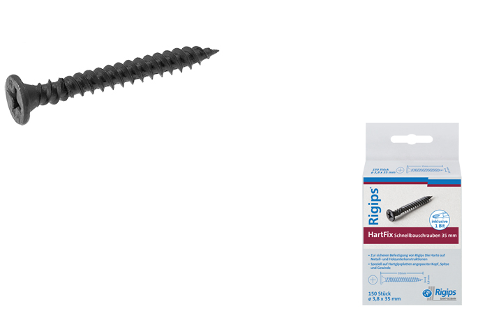 Die Rigips HartFix Schnellbauschraube (Typ UMN nach EN 14566) ist phosphatiert und verfügt über einen Schneidringkopf, eine Nadelspitze und ein gegenläufiges Gewinde am Schraubenkopf. Die Schnellbauschraube dient der Befestigung von Rigips Die Harte auf Metallunterkonstruktionen aus Stahlblech bis 0,7 mm Dicke.
