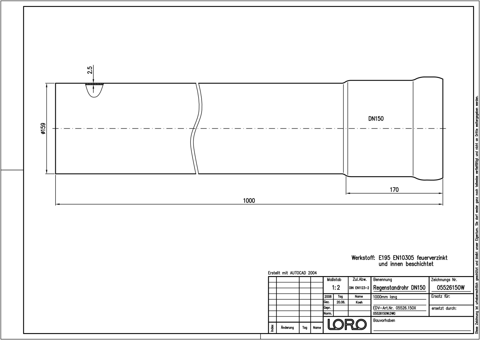 LORO-X Regenstandrohr, aus Stahl, feuerverzinkt, rund, ohne Reinigungsöffnung nach DIN EN 1123 mit erhöhtem Qualitätsstandard gemäß RAL-Gütezeichen, mit 2-Kammern-Steckmuffenverbindung, Baustoffklasse A1, formstabil, bruchfest, rückstausicher, langlebige Innenbeschichtung gemäß DIN EN ISO 2178 auf Basis einer 2K-Epoxid-Kombination, Farbton: Rotbraun, 1000 mm, DN 150