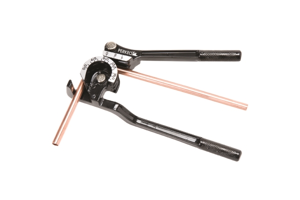 Kompaktes Zweihand Biegegerät mit langem Hebel und Biegeradius-Anzeige 45° - 90° - 135° - 180°zum maßgenauen Biegen von mm und Zoll-Rohren aus Kupfer, Messing, Aluminium und Weichstahl in je drei unterschiedlichen Rohrdimensionen.