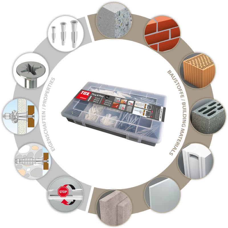 • Das Sortiment Plug & Play beinhaltet drei Dübelgrößen (Ø 5, 6 und 8 mm) für die häufigsten Projekte