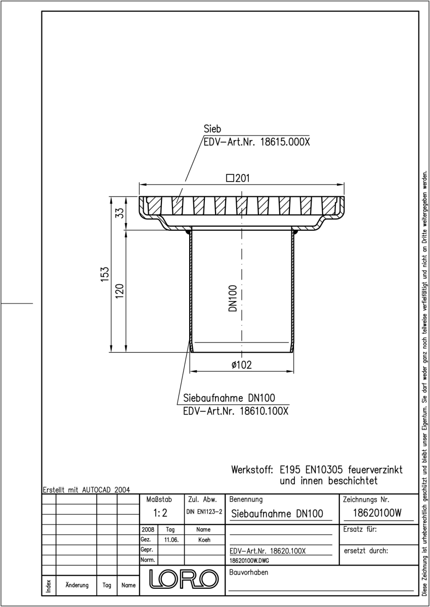 LORO-Siebeinheit, begehbar, aus Stahl, feuerverzinkt, langlebige Innenbeschichtung gemäß DIN EN ISO 2178 auf Basis einer 2K-Epoxid-Kombination, Farbton: Rotbraun bestehend aus Sieb 187 x 187 mm, aus Gusseisen, asphaltiert, Kl. L (1,5 t), Siebaufnahme 199 x 199 mm (für Anbauhöhe 40 - 75 mm), DN 100