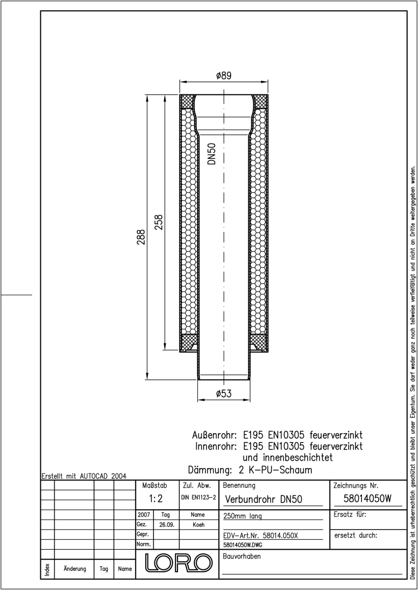 LORO-X Verbundrohr bestehend aus Innenrohr (LORO-X Rohr, aus Stahl feuerverzinkt, nach DIN EN 1123, mit erhöhtem Qualitätsstandard gemäß RAL-Gütezeichen GZ-694, mit 2-Kammern-Steckmuffenverbindung, Baustoffklasse A1, formstabil, bruchfest, rückstausicher, langlebige Innenbeschichtung gemäß DIN EN ISO 2178 auf Basis einer 2K-Epoxid-Kombination, Farbton: Rotbraun), Dämmschicht (PU-Hartschaum B2, FCKW-frei) und Außenrohr (LORO-X Rohr, aus Stahl, feuerverzinkt), 250 mm lang, DN 50