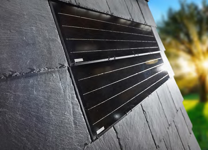 Die integrierbaren Solarmodule sind flach, rahmenlos und fügen sich unauffällig in die Struktur des Rathscheck Schiefer-System ein. Dadurch entsteht ein geradliniges, ebenmäßiges Deckbild ohne ästhetische Kompromisse.