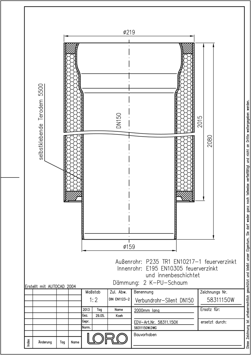 LORO-X Verbundrohr, Ausführung SILENT, für erhöhte Schalldämmung, bestehend aus: Innenrohr (LORO-X Rohr, aus Stahl, feuerverzinkt, nach DIN EN 1123, mit erhöhtem Qualitätsstandard gemäß RAL-Gütezeichen GZ-694, mit 2-Kammern-Steckmuffenverbindung, Baustoffklasse A1, formstabil, bruchfest, rückstausicher, langlebige Innenbeschichtung gemäß DIN EN ISO 2178 auf Basis einer 2K-Epoxid-Kombination, Farbton: Rotbraun), Schallschutzmatte (am Innenrohr angebracht), Dämmschicht (PU-Hartschaum B2, FCKW-frei) und Außenrohr (LORO-X Rohr, feuerverzinkt) 2000 mm lang, DN 150