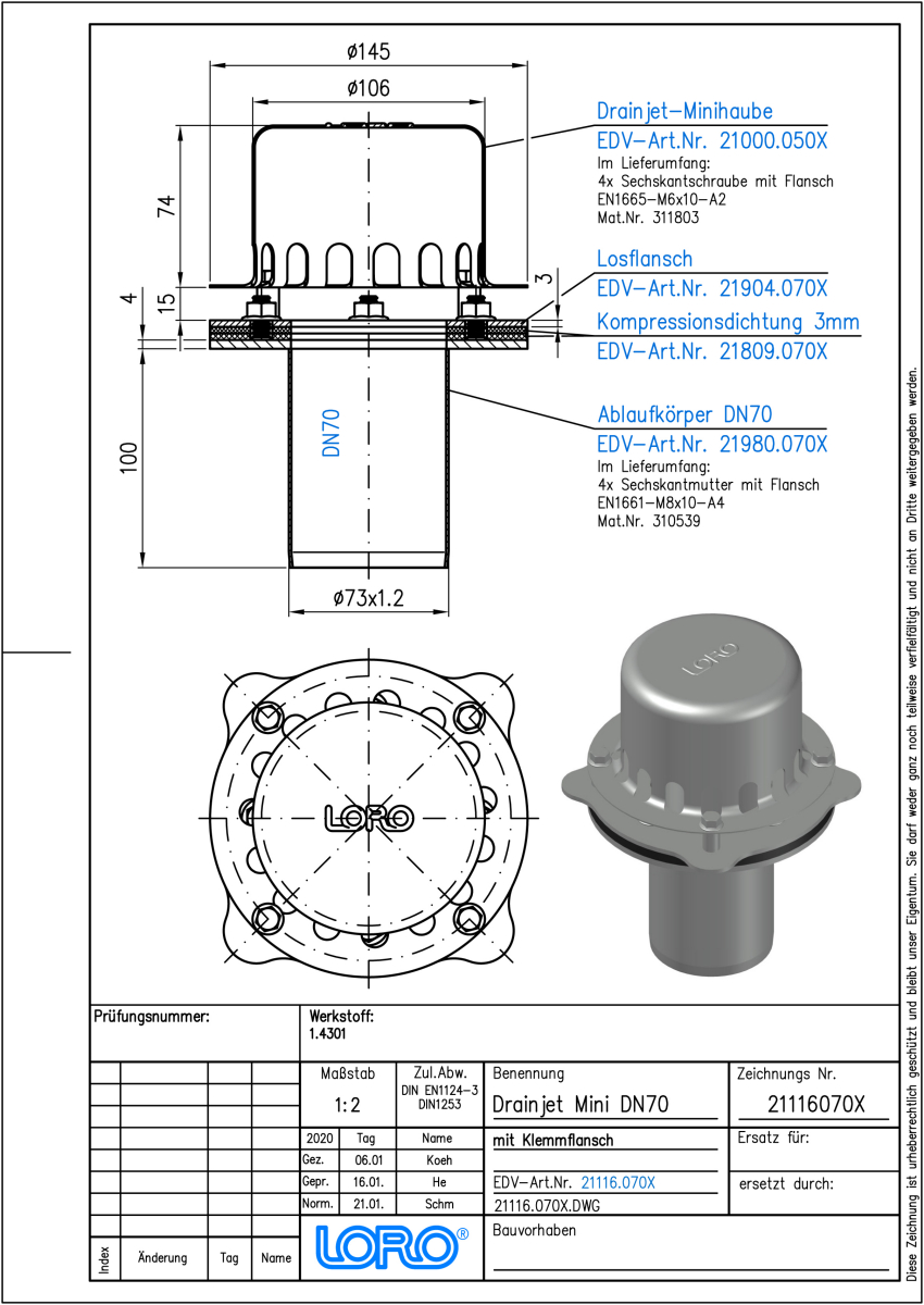 LORO-X DRAINJET-Mini, Serie 49(DJ) einteilig, Auslauf senkrecht, für Hauptentwässerung mit Druckströmung, Abflussleistung 5,7 l/s bei 55 mm Wasserhöhe auf dem Dach, mit Klemmflansch als Los- und Festflanschkonstruktion, für metallische Kastenrinnen, DRAINJET-Mini Haube aus Edelstahl, nach DIN EN 1253 mit erhöhtem Qualitätsstandard, Leistungsnachweis mit normgerechtem Prüfsystem mit 4,2m nicht belüfteter Fallleitung gemäß LX-Datenblatt LX3044, aus Edelstahl, DN 70