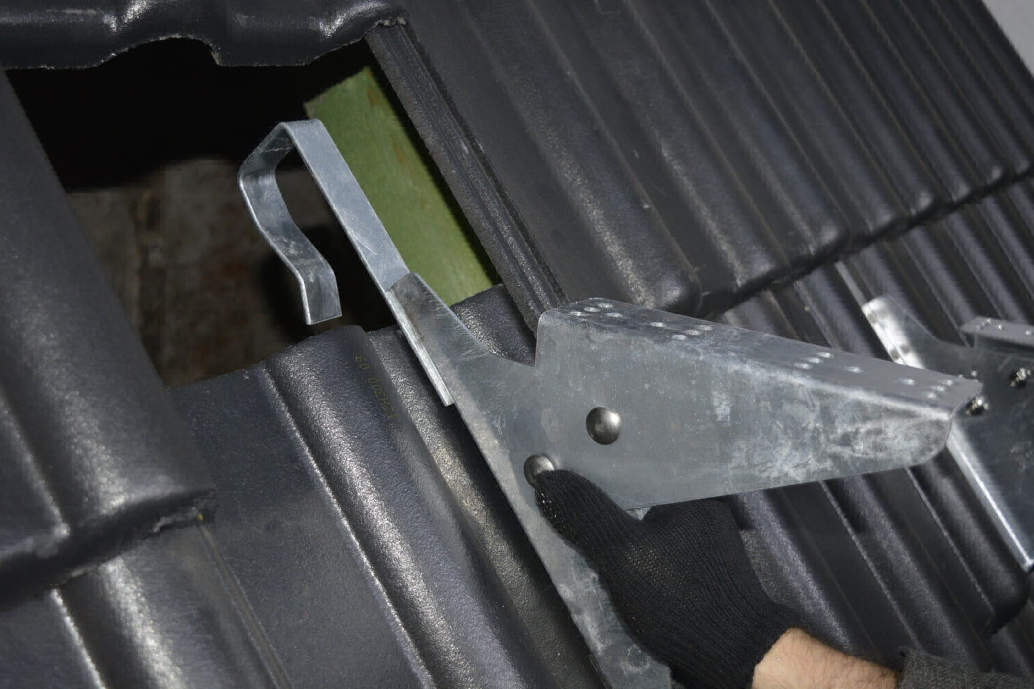 Die Dachpfannen müssen nur nach oben geschoben werden, die Laufroststützen werden eingehängt und der Standrost wird auf den Stützen befestigt.
