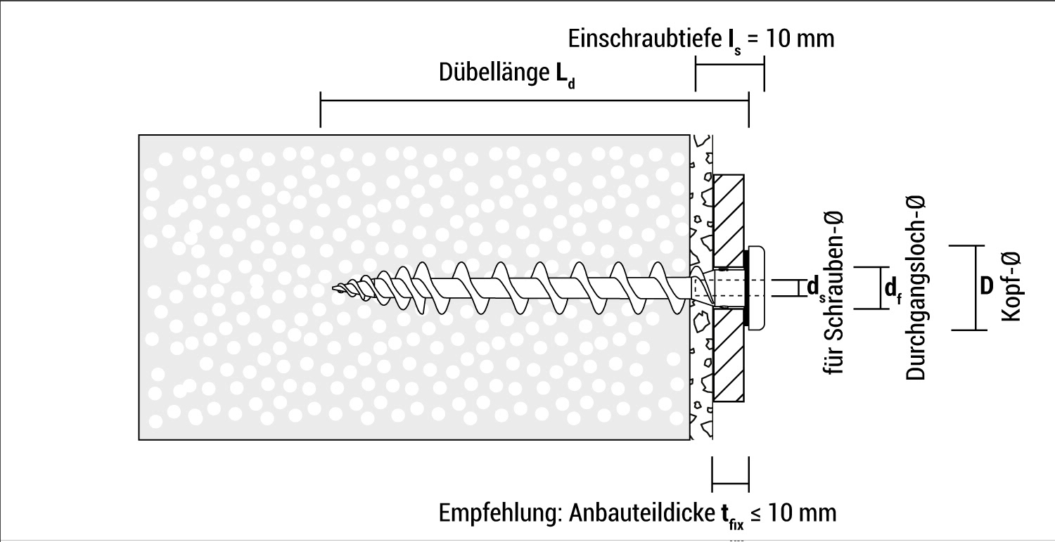 - Vorbohren in Putz entfällt (≤ 7mm) aufgrund scharfer Bohrspitze