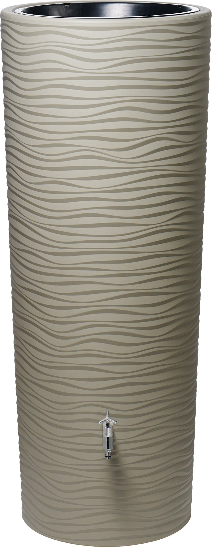 Natur pur! Der Behälter mit wellenförmiger Oberflächenstruktur präsentiert sich je nach Lichteinfall in immer neuen Facetten. So setzt der Natura 2in1 Regenspeicher lebendige Akzente auf Ihrer Terrasse.
