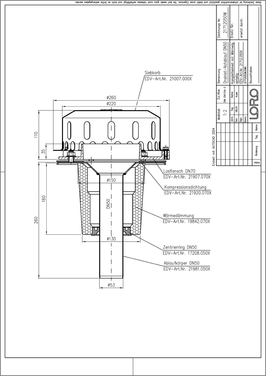 LORO-X DRAINLET Flachdachablauf, Serie 84(DL) einteilig mit Wärmedämmung, Auslauf senkrecht, für Notentwässerung mit Freispiegelströmung, Abflussleistung 7,5 l/s bei 75 mm Wasserhöhe auf dem Dach, mit Klemmflansch als Los- und Festflanschkonstruktion inklusive Kompressionsdichtungen, für Bitumen- und Kunststoff- Abdichtungsbahnen, DRAINLET-Haube aus Edelstahl, nach DIN EN 1253 mit erhöhtem Qualitätsstandard gemäß RAL-Gütezeichen GZ-694, Leistungsnachweis mit normgerechtem Prüfsystem mit 4,2m nicht belüfteter Fallleitung gemäß LX-Datenblatt LX1385, aus Edelstahl, DN 50