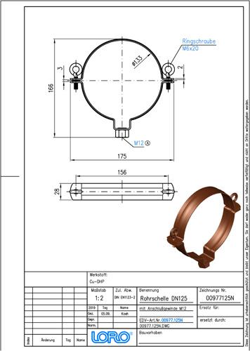 LORO-N Rohrschelle, aus Kupfer, mit Anschlussgewinde M 12, ohne Schalldämmung, DN 125