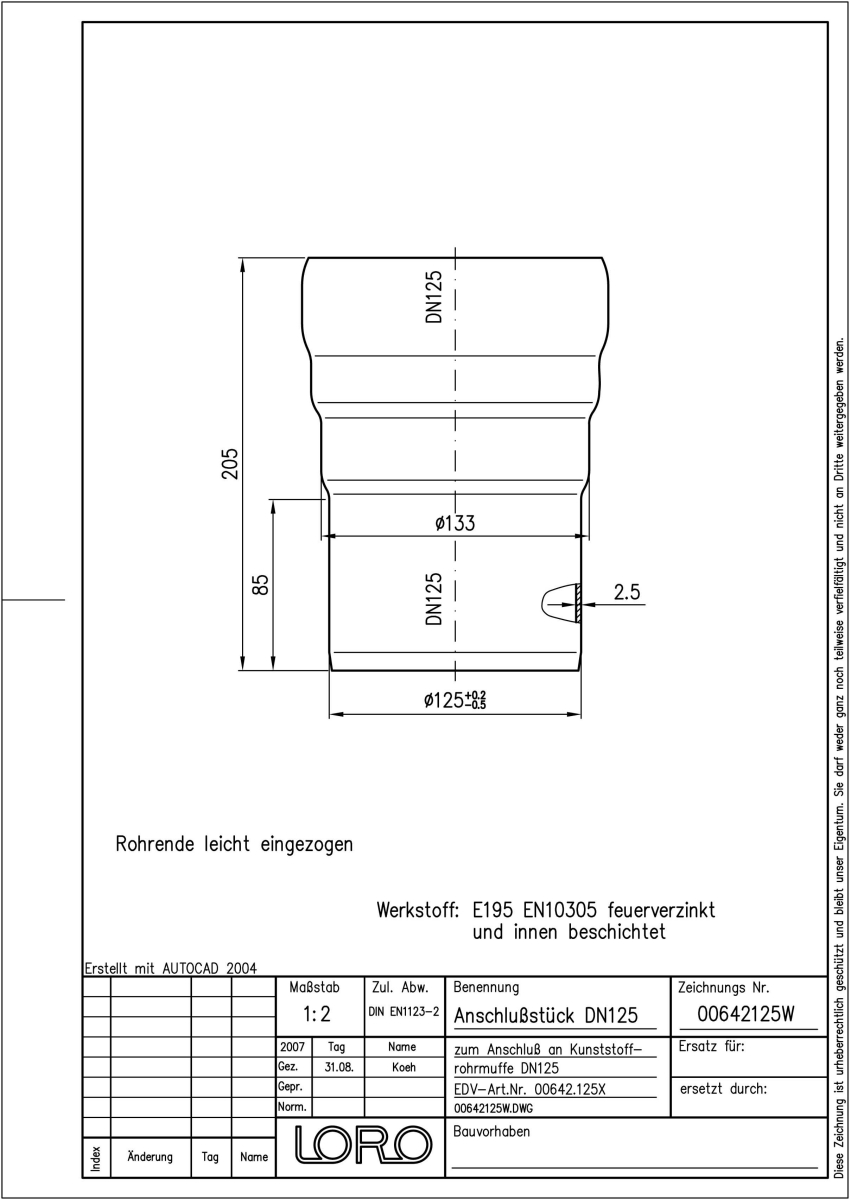 LORO-X Anschlussstück aus Stahl, feuerverzinkt, von LORO-X Rohr DN 125 an Kunststoffrohrmuffe DN 125 nach DIN EN 1123 mit erhöhtem Qualitätsstandard gemäß RAL-Gütezeichen GZ-694, mit 2-Kammern-Steckmuffenverbindung, Baustoffklasse A1, formstabil, bruchfest, rückstausicher, langlebige Innenbeschichtung gemäß DIN EN ISO 2178 auf Basis einer 2K-Epoxid-Kombination, Farbton: Rotbraun, DN 125/125