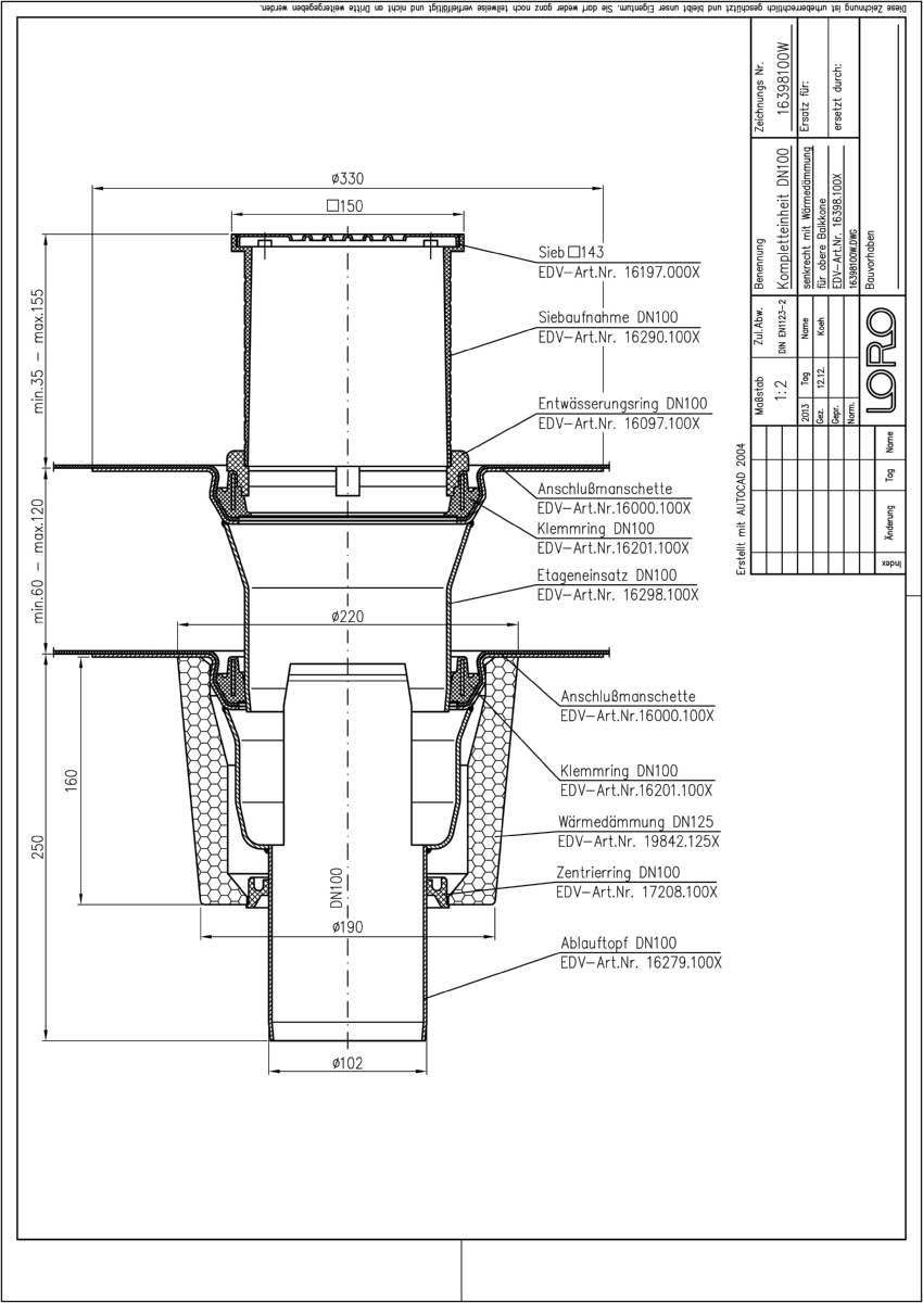 LORO-X Balkondirektablauf, Serie H, zweiteilig mit Wärmedämmung, Auslauf senkrecht, mit vormontierter Anschlussmanschette aus Bitumen EPDM Verbund, nach DIN EN 1253 mit erhöhtem Qualitätsstandard gemäß RAL-Gütezeichen GZ-694, aus Stahl feuerverzinkt, mit langlebiger Beschichtung gemäß DIN EN ISO 2178 auf Basis einer 2K-Epoxid-Kombination, Farbton: Rotbraun, bestehend aus Ablauftopf, Anschlussmanschette, Klemmring ohne Entwässerungsöffnungen, Etageneinsatz (für Aufbauhöhe 60 - 120 mm), Anschlussmanschette, Klemmring, Entwässerungsring, Siebaufnahme (für Aufbauhöhe 35 - 155 mm), Sieb für obere Balkone, DN 100