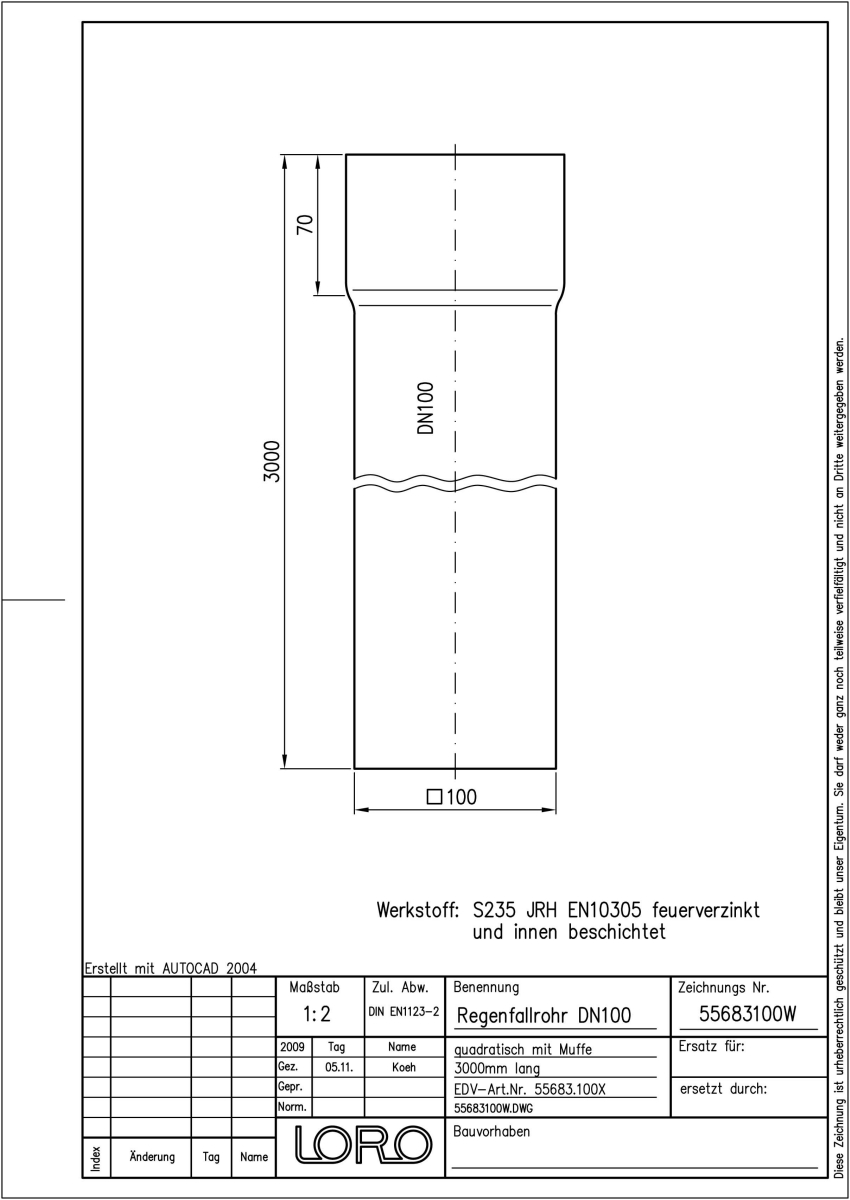 LORO-Regenfallrohr, aus Stahl, feuerverzinkt, quadratisch, nach DIN EN 1123, mit erhöhtem Qualitätsstandard gemäß RAL-Gütezeichen GZ-694, Baustoffklasse A1, formstabil, bruchfest, langlebige Innenbeschichtung gemäß DIN EN ISO 2178 auf Basis einer 2K-Epoxid-Kombination, Farbton: Rotbraun, 3000 mm, 1 Muffe, DN 100