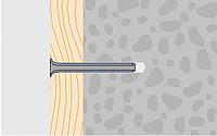 Schlagschraube: Stahl, galvanisch verzinkt. Dübelhülse: Hochwertiger Polyamid PA 6. Geeignete Baustoffe: Beton C20/25, Vollziegel, Kalksandstein, Lochstein, Naturstein.