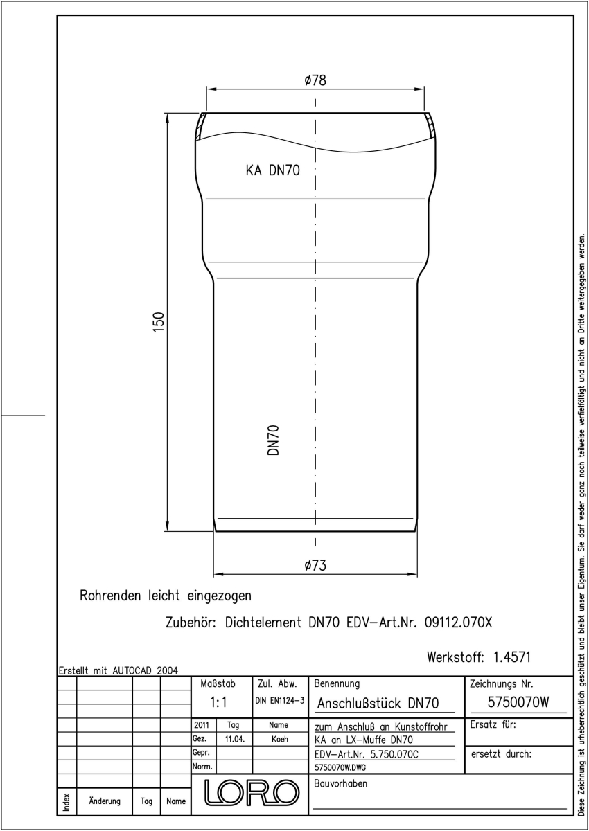 LORO-XCL Anschlussstücke, aus Edelstahl, Werkstoff Nr. 1.4571, gebeizt und passiviert, zum Übergang von KA/HT-Rohr an LORO-XCL Muffe, nach DIN EN 1124 mit erhöhtem Qualitätsstandard gemäß RAL-Gütezeichen GZ-694, mit 2-Kammern-Steckmuffenverbindung, Baustoffklasse A1, formstabil, bruchfest, rückstausicher, DN 70