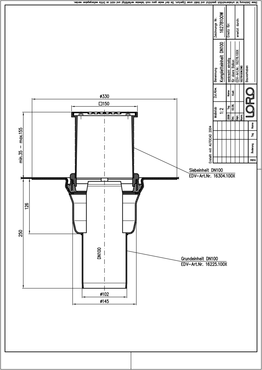 LORO-X Balkondirektablauf, Serie H, einteilig ohne Wärmedämmung, Auslauf senkrecht, mit vormontierter Anschlussmanschette aus Bitumen EPDM Verbund, nach DIN EN 1253 mit erhöhtem Qualitätsstandard gemäß RAL-Gütezeichen GZ-694, aus Stahl feuerverzinkt, mit langlebiger Beschichtung gemäß DIN EN ISO 2178 auf Basis einer 2K-Epoxid-Kombination, Farbton: Rotbraun, bestehend aus Ablauftopf, Anschlussmanschette, Klemmring, Entwässerungsring, Siebaufnahme (für Aufbauhöhe 35 - 155 mm), Sieb für obere Balkone, DN 100