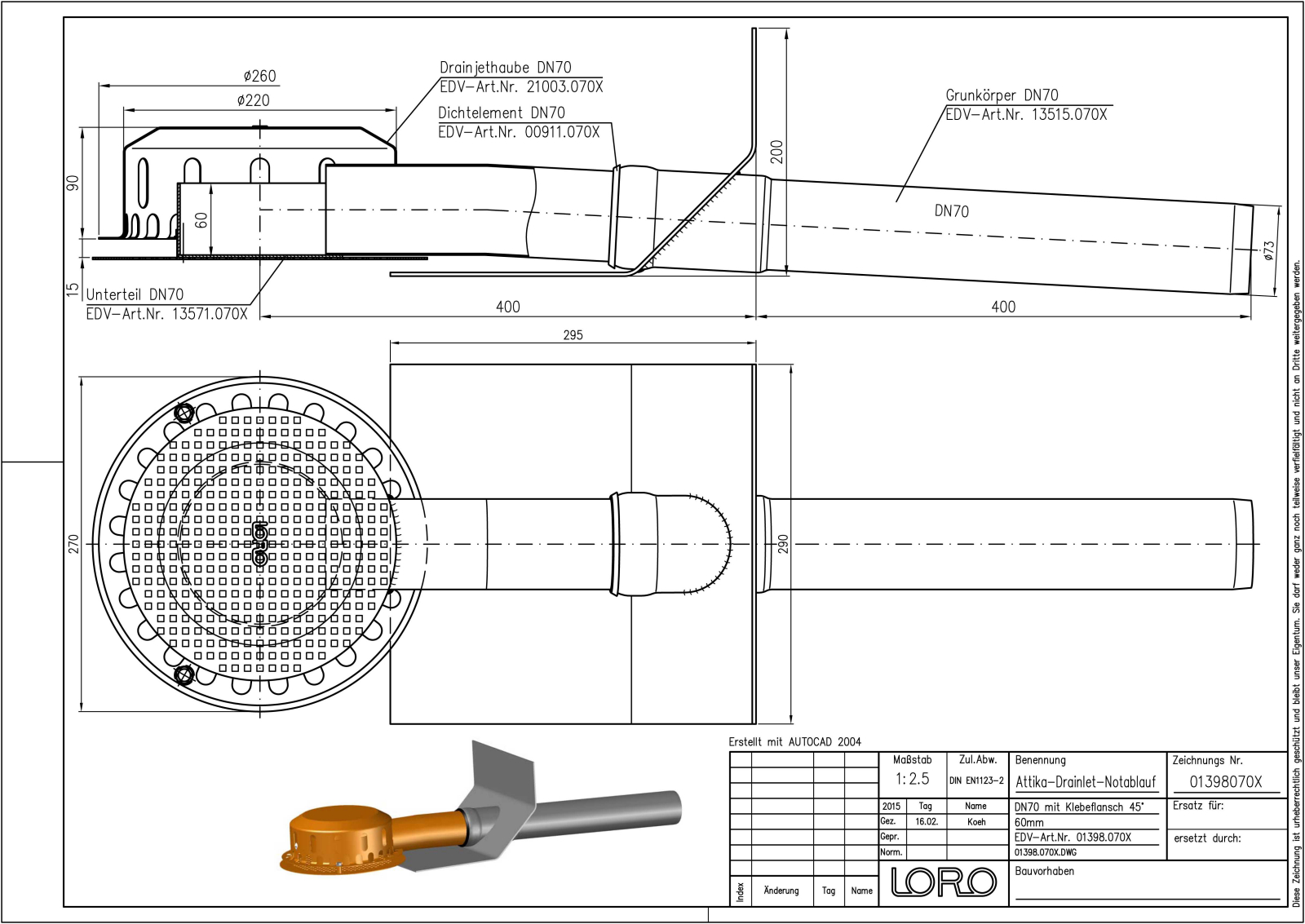 LORO-X DRAINLET Attikaablauf, Serie 62 ohne Eingriff ins Dach, für Notentwässerung mit Freispiegelströmung, Abflussleistung 1,3 l/s bei 75 mm Wasserhöhe auf dem Dach und 60 mm Wehrhöhe, mit Klebeflansch, 45 Grad Aufkantung für Bitumen-Abdichtungsbahnen, Eingrifftiefe 0 mm, nach DIN EN 1253, Leistungsnachweis als Speier ohne Fallleitung gemäß Systemdatenblatt LX1587, aus Edelstahl, DN 70