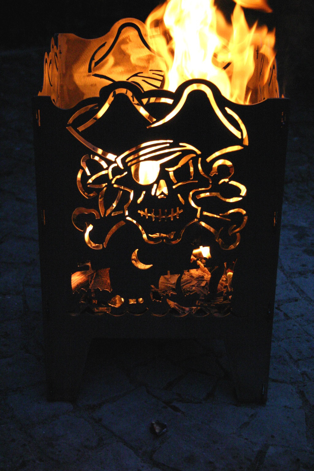 Feuerkorb Größe XXL Motiv Pirat mit attraktiven Lichtspiel-Effekten 2,0 mm Rohstahl (rostend) gefertigt - Stecksystem - Feuerkorb ist zerlegbar - Der massive Gitterrost sowie das integrierte Ascheblech gewährleisten Stabilität und Standsicherheit. Der große Bodenabstand schont den Untergrund.
