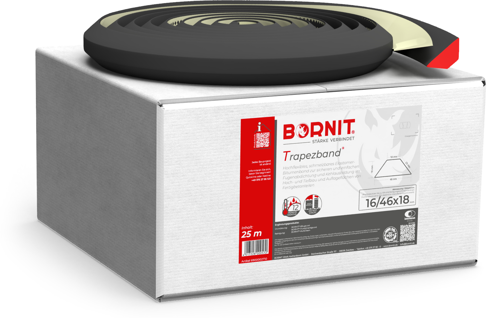Elastomerbitumenband in Trapezform zur Kehlabdichtung im Hoch- und Tiefbau, zur Abdichtung an Auflageflächen von Fertigbetonteilen sowie als Eckkeil bei der Verlegung von Dach- und Schweißbahnen. Grundierung mit BORNIT®-Bitugrund oder BORNIT®-Fundamentgrund.