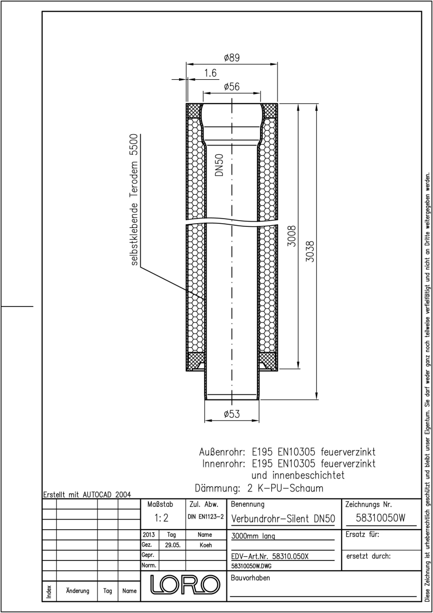 LORO-X Verbundrohr, Ausführung SILENT, für erhöhte Schalldämmung, bestehend aus: Innenrohr (LORO-X Rohr, aus Stahl, feuerverzinkt, nach DIN EN 1123, mit erhöhtem Qualitätsstandard gemäß RAL-Gütezeichen GZ-694, mit 2-Kammern-Steckmuffenverbindung, Baustoffklasse A1, formstabil, bruchfest, rückstausicher, langlebige Innenbeschichtung gemäß DIN EN ISO 2178 auf Basis einer 2K-Epoxid-Kombination, Farbton: Rotbraun), Schallschutzmatte (am Innenrohr angebracht), Dämmschicht (PU-Hartschaum B2, FCKW-frei) und Außenrohr (LORO-X Rohr, feuerverzinkt) 3000 mm lang, DN 50