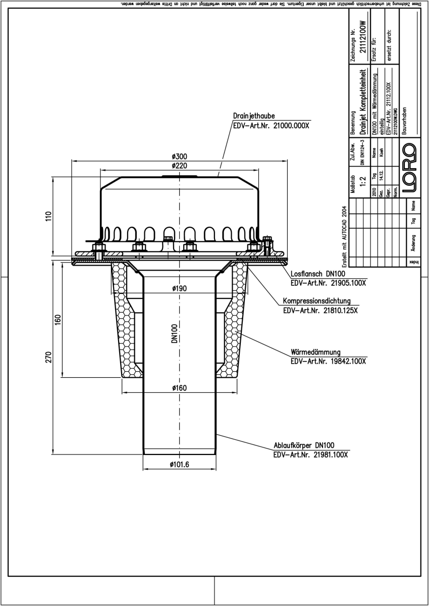 LORO-X DRAINJET Flachdach-Schnellablauf, Serie 49(DJ) einteilig mit Wärmedämmung, Auslauf senkrecht, für Hauptentwässerung mit Druckströmung, Abflussleistung 27,0 l/s bei 55 mm Wasserhöhe auf dem Dach, mit Klemmflansch als Los- und Festflanschkonstruktion inklusive Kompressionsdichtungen, für Bitumen- und Kunststoff- Abdichtungsbahnen, DRAINJET-Haube aus Edelstahl, nach DIN EN 1253 mit erhöhtem Qualitätsstandard gemäß RAL-Gütezeichen GZ-694, Leistungsnachweis mit normgerechtem Prüfsystem mit 4,2m nicht belüfteter Fallleitung gemäß LX-Datenblatt LX530, aus Edelstahl, DN 100