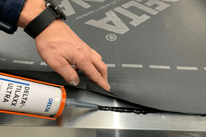 DELTA®-TILAXX ULTRA ermöglicht funktionssichere Anschlüsse der DELTA®-ALPINA auf Trauf- und Anschlussblechen und an aufgehenden BauteilenGesundheitsschutz