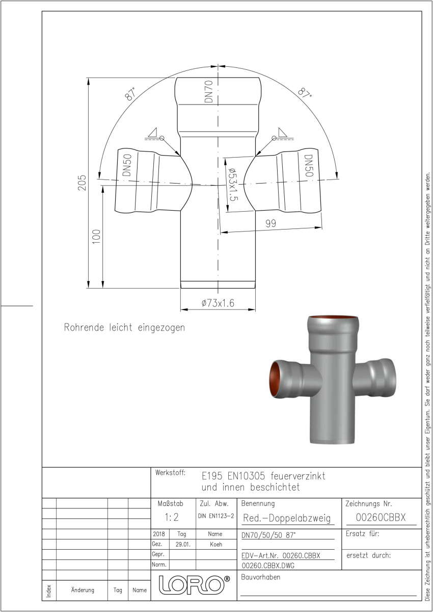 LORO-X Red.-Doppelabzweig, aus Stahl, feuerverzinkt, nach DIN EN 1123 mit erhöhtem Qualitätsstandard gemäß RAL-Gütezeichen GZ-694 , mit 2-Kammern-Steckmuffenverbindung, Baustoffklasse A1, formstabil, bruchfest, rückstausicher, langlebige Innenbeschichtung gemäß DIN EN ISO 2178 auf Basis einer 2K-Epoxid-Kombination, Farbton: Rotbraun, 87 Grad, DN 70/50/50