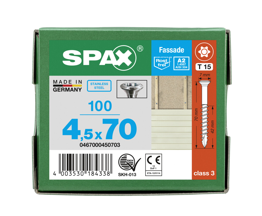 - SPAX CUT-Spitze: punktgenaues Ansetzen, ermöglicht Einschrauben ohne Vorbohren (holzabhängig), verringert wirkungsvoll ein Spleißen des Holzes
